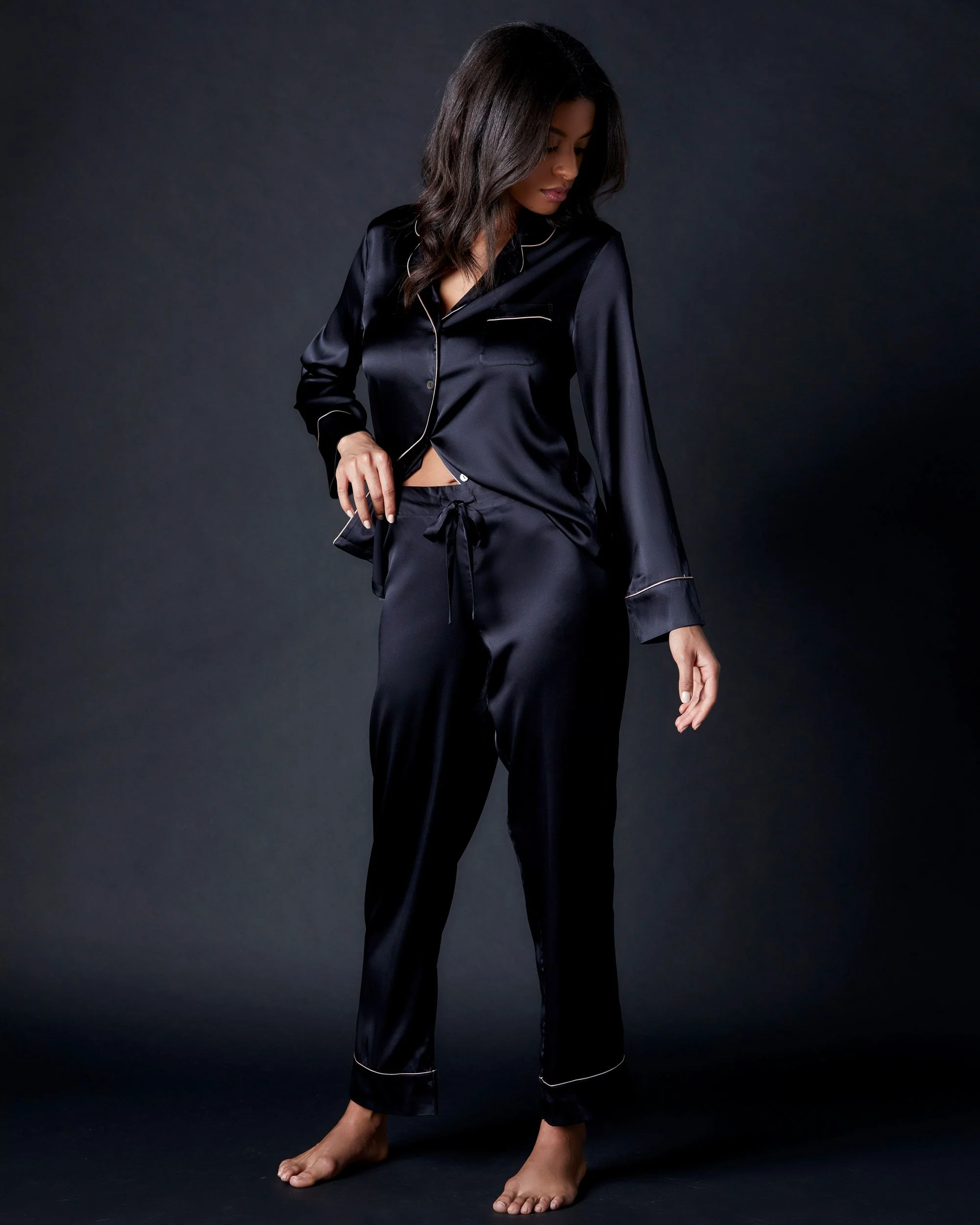 - Long, luxurious PJ set in decadent stretch silk